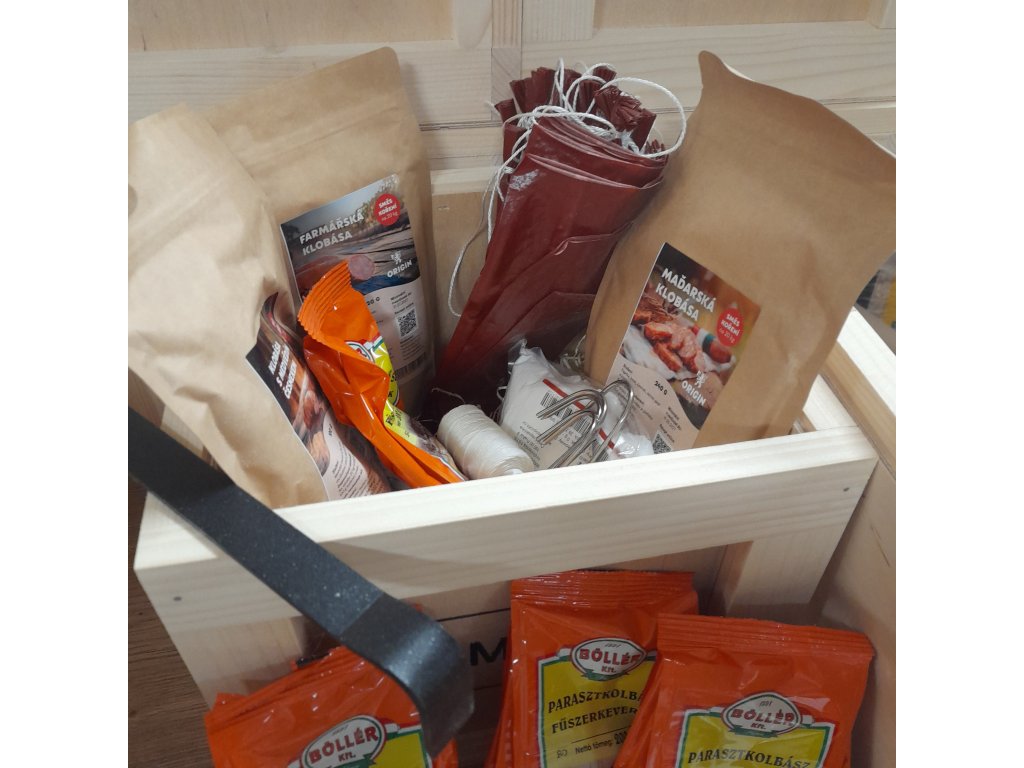 Naplněný TOMIBOX obsahuje pečlivě vybrané pomůcky a ingredience pro domácí výrobu klobás a salámů: